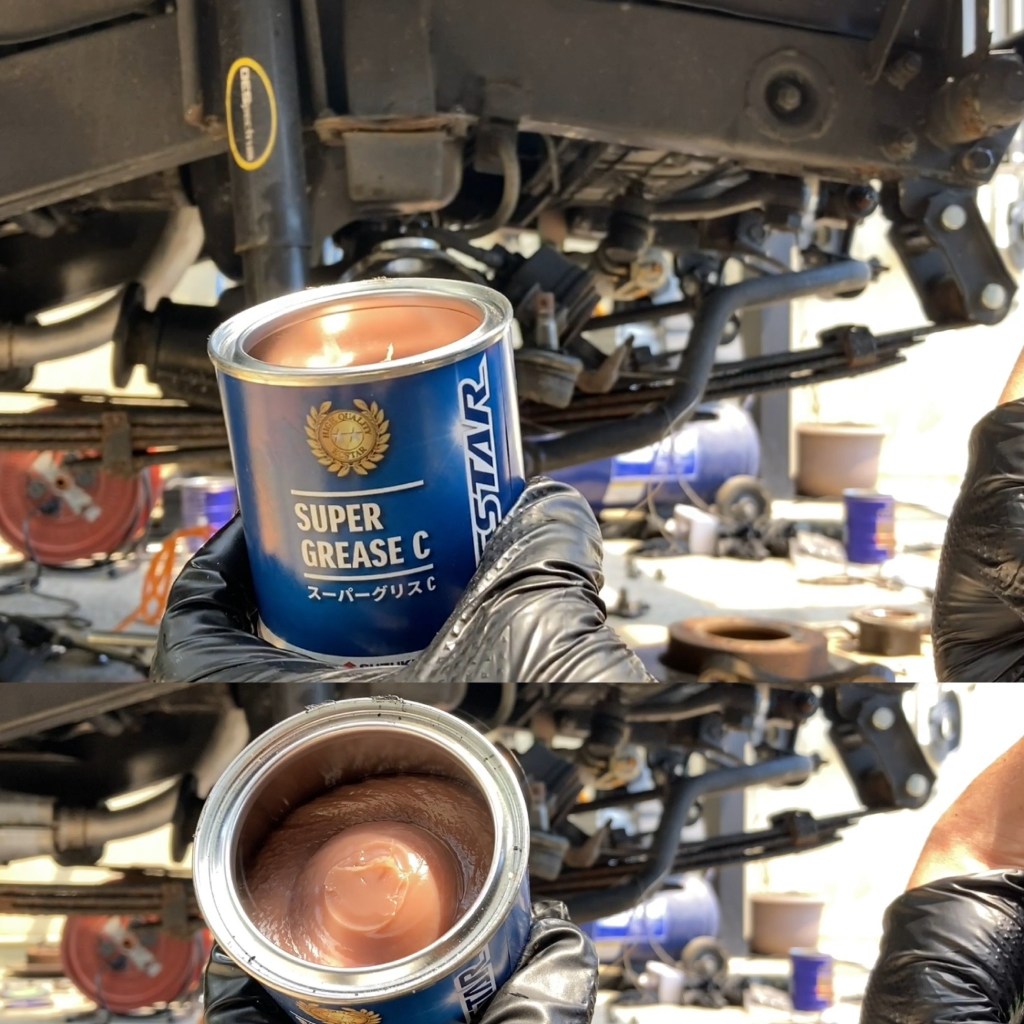 ベアリングには全て純正のサービスマニュアル指定のグリースCと塗布 上の方は重量で落ちるらしいので、新品のキングピンベアリング内部に入れ込み、アウターレースにもはみ出るくらいたっぷり塗った(社外品でキタガワさんが出しているグリースホルダーもあるらしいでもその分プレロード調整なども必要になるらしい。今回はフル純正仕様で組みました。)またハブベアリングにも塗布