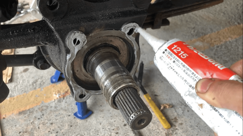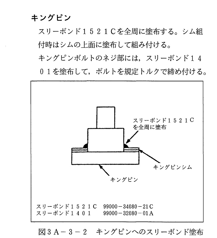 部品同士の接合部や設置面は密封性や耐水性を高めるためサービスマニュアルのセメダイン366EやThree Bondo 1215を塗布しました。使用したのはナックルのリテーナーとナックル間、リテーナーとナックルオイルシール間の設置面です。