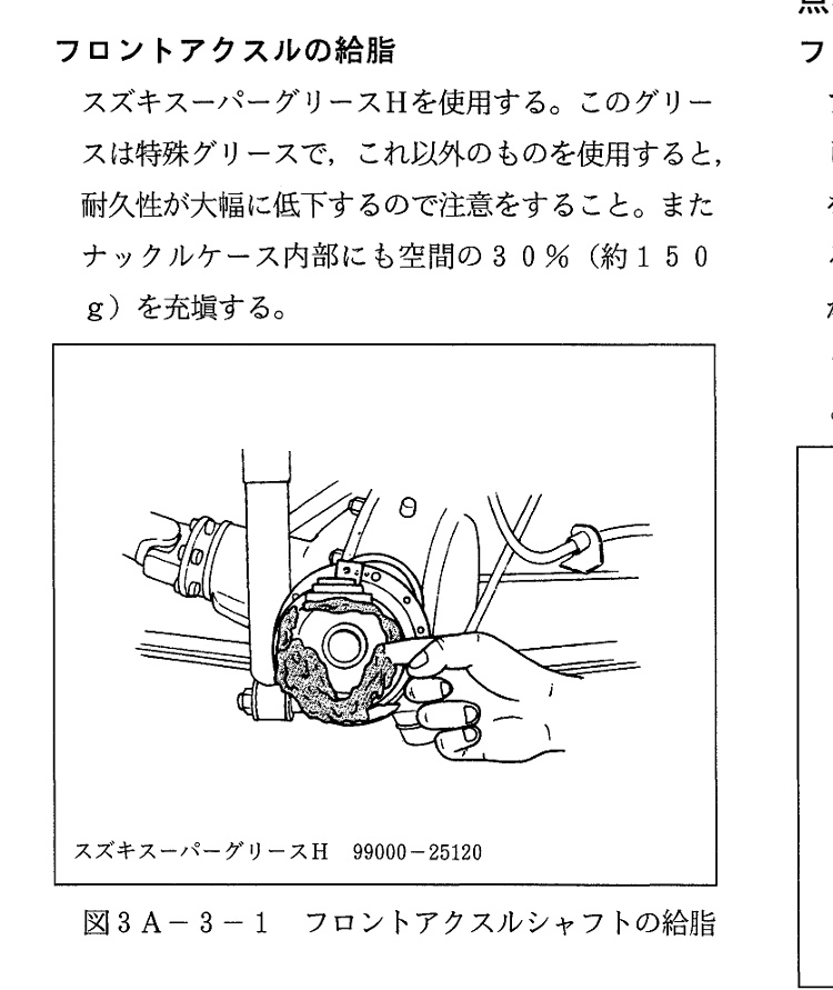- スズキスーパーグリスH(ナックルハウジング内に牛のうんこの量くらいマニュアルでは150gまたはハウジング内30%ほど ドライブシャフトのボールジョイント部にもたっぷり塗り入れました。ナックルハウジング内だけじゃ無く外側とナックルのオイルシールリップ部にも忘れなく)