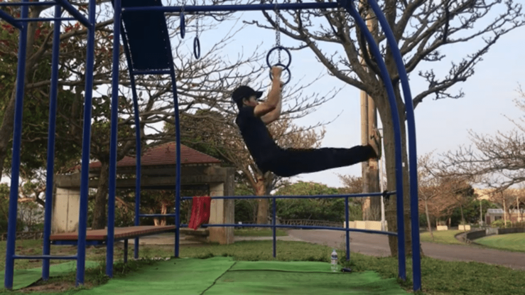 まっすぐの鉄棒がないので、雲梯や吊り輪などつかって懸垂は可能。