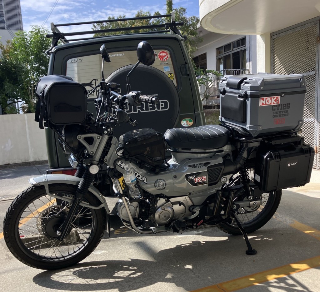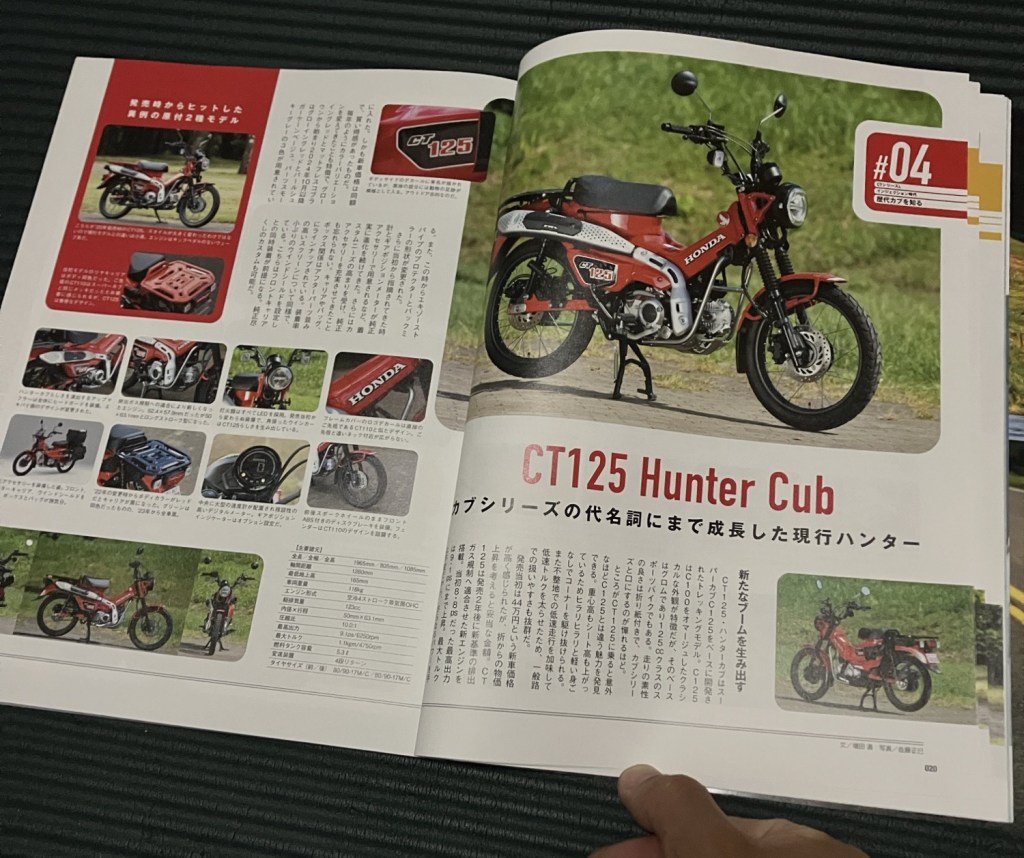 それから現代に蘇りCT125 Hunter Cub(高い位置の吸気ダクトとアップマフラー、エンジンガードも受け継ぎ生まれ変わった。足つきはカブの中では1番悪いほどシート高が高く乗れない人も多いので最初はほとんど車高かローダウンシートを取り付ける例が多い。
