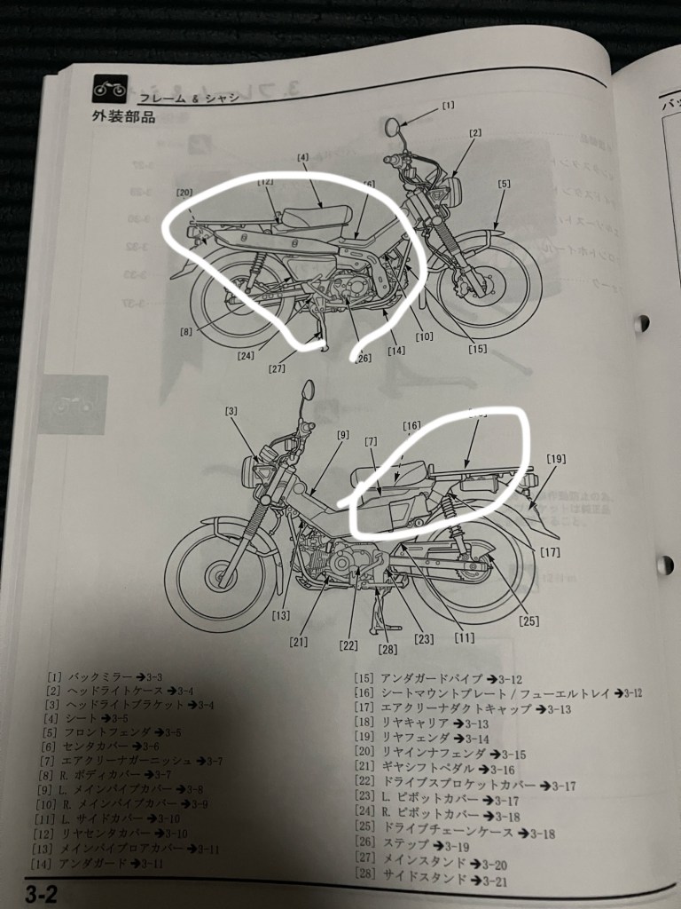 JA65 (5型) 2025年 3色 グローイングレッド(赤) パールシュガーケーンベージュ(白系ベージュ) パールスモーキーグレー(グレー) マフラーがより排気ガス規制に厳しいユーロ5+基準クリアの触媒搭載のマフラーで遮熱板(マフラー根本)のデザイン変更、純正ギアポジションインジケータが用意に後付けできるようにハーネスがヘッドライト内標準装備。私のハンターカブがこの2025年のパールスモーキーグレーにあたる5型になる。後ろの反射板は廃止フロントのみになった。