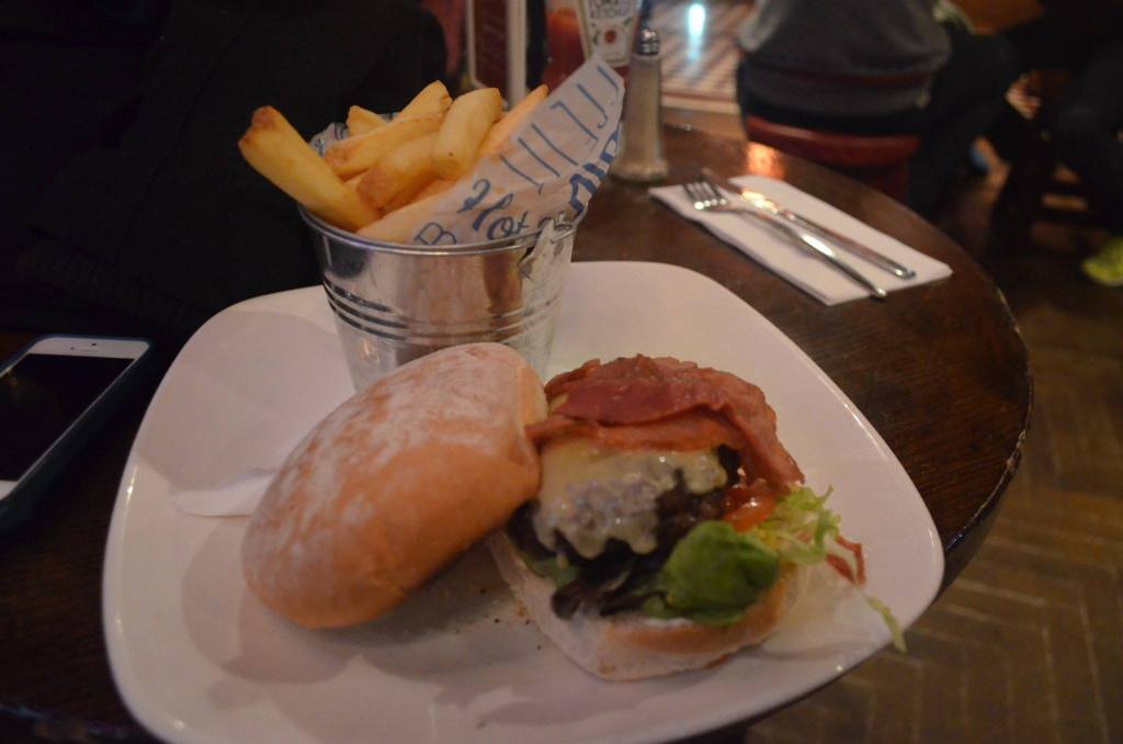 Homemade Hereford Irish beef burger, with Dublin cheese, shallot and bacon relish, tomato, iceberg lettuce, cornichon and homemade chips. ギロチンで処刑されたチャールズ王1世の名前のハンバーガー また横に飛び出たベーコンは彼の舌を表すらしい。